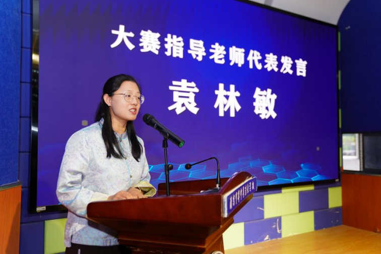 大赛指导教师代表袁林敏分享了备赛历程与育人经验,系统复盘了赛事经历,充分展现了系部教师潜心育人、精心竞技的专业能力与责任担当。现场通过视频回顾了参赛选手备赛与竞赛的精彩瞬间,记录了他们在技能逐梦道路上付出的汗水、坚持与收获的荣誉。