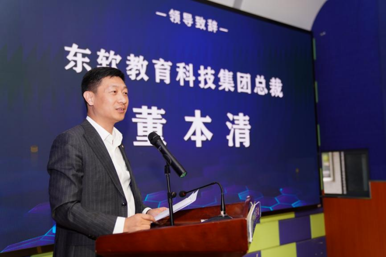 东软教育科技集团总裁董本清致辞,向在2026年江苏省职业院校技能大赛中获奖的师生致以热烈祝贺,勉励同学们坚守技能报国初心,精进专业能力,以匠心精神致初心,以扎实技能赢未来,应依托产教融合模式,着力培养符合数字经济发展需求的高素质技能人才,促进专业对接产业,毕业就业胜任岗位,未来引领行业创新,切实实现“技能立身、匠心报国”。