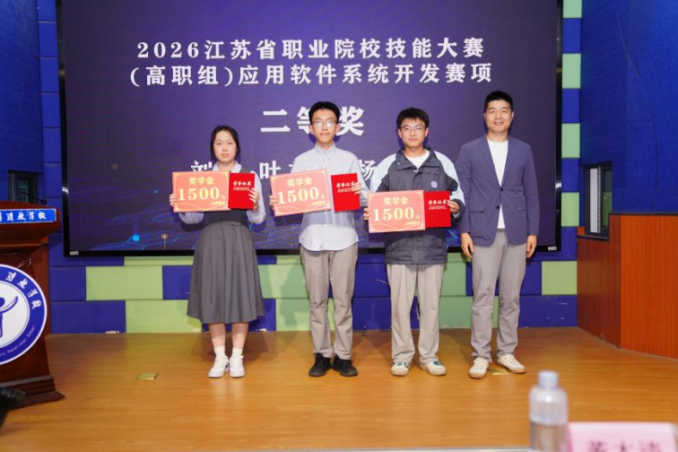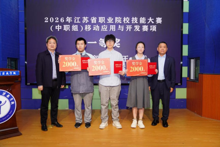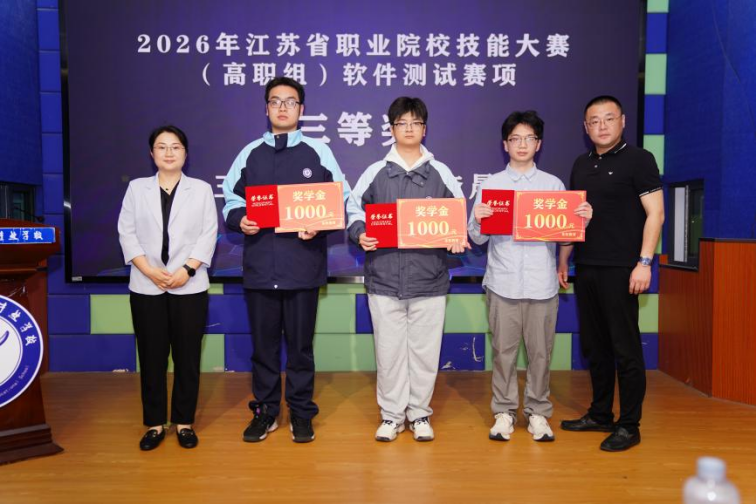 在颁奖环节,俞斌副校长与东软教育科技集团苏云峰主任,陈仕祺副校长,江苏科交建轨道交通科技有限公司曾香副总经理与中科创达教育事业部管伟经理先后为技能大赛荣获一二三等奖的学生颁奖。